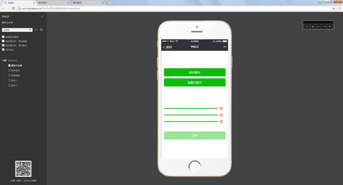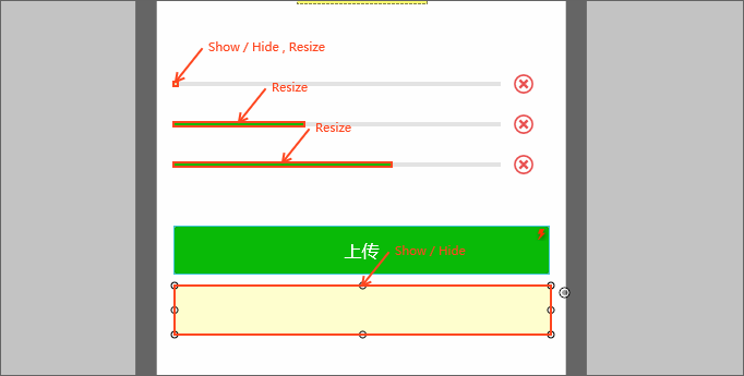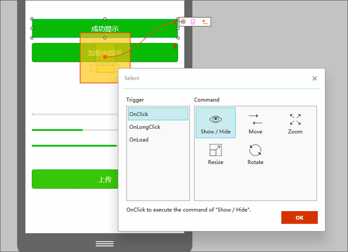 在提示和上傳頁面中,我使用了交互,點擊“成功提示”按鈕,彈出提示。點擊“上傳”按鈕,完成進(jìn)度條的走動。
