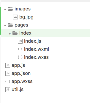 大家可以看到,有一個 index 目錄里面是主頁。 app.js 是程序主入口, utils.js 是咱們的工具腳本,用于讀取天氣數(shù)據(jù)。 還有一個 bg.jpg 的圖片文件,是小程序的背景圖。