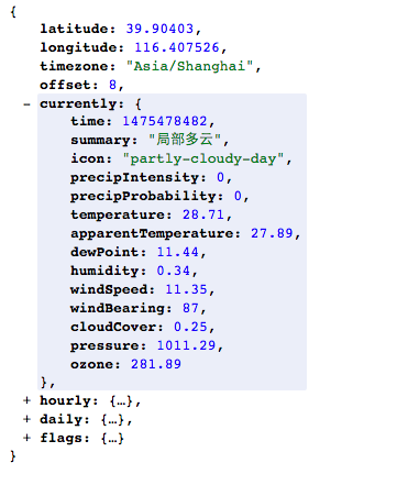 從上面的代碼不難看出,我們只取得了原始結(jié)果集的 currently 和 daily 數(shù)據(jù),然后重新返回。 為什么我們要這樣取得部分?jǐn)?shù)據(jù)呢,主要是因?yàn)檫@個接口的其他數(shù)據(jù)我們并不需要,所以就沒必要再傳給應(yīng)用層了。 原始數(shù)據(jù)的格式給大家貼一下: