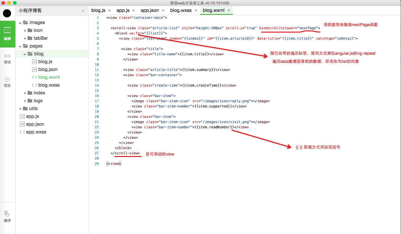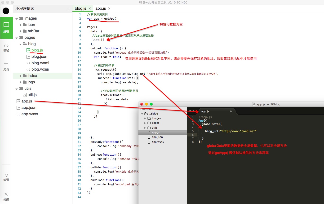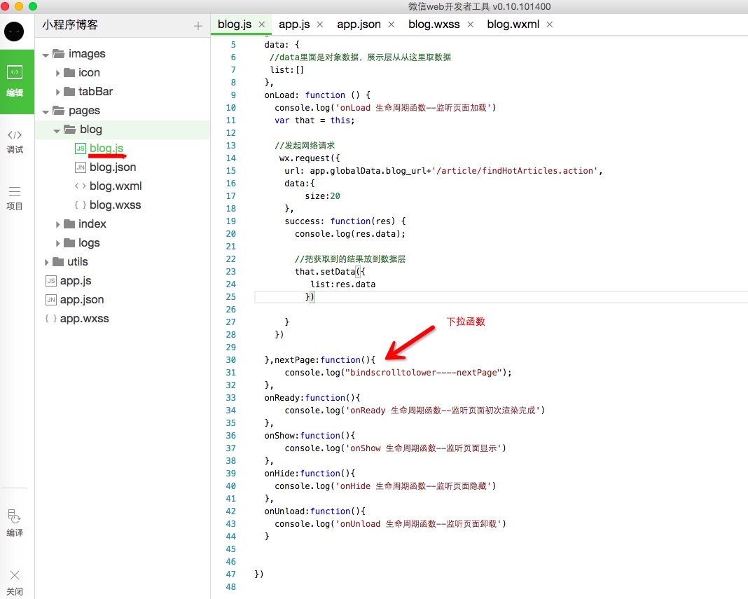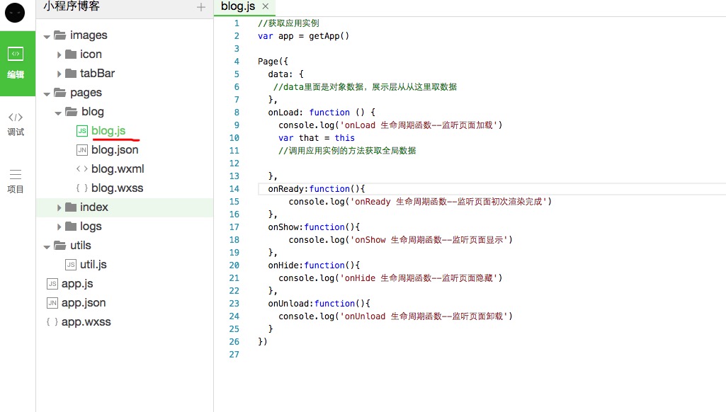 3、打開(kāi)blog文件夾,編輯blog.js,page函數(shù)里面添加對(duì)象,data對(duì)象表示數(shù)據(jù),即和后臺(tái)交互的數(shù)據(jù)都在這里面存儲(chǔ)和展示,onLoad,onReady等函數(shù)是微信在頁(yè)面加載時(shí)默認(rèn)存在的函數(shù),我們可以重寫,實(shí)現(xiàn)我們自己的邏輯