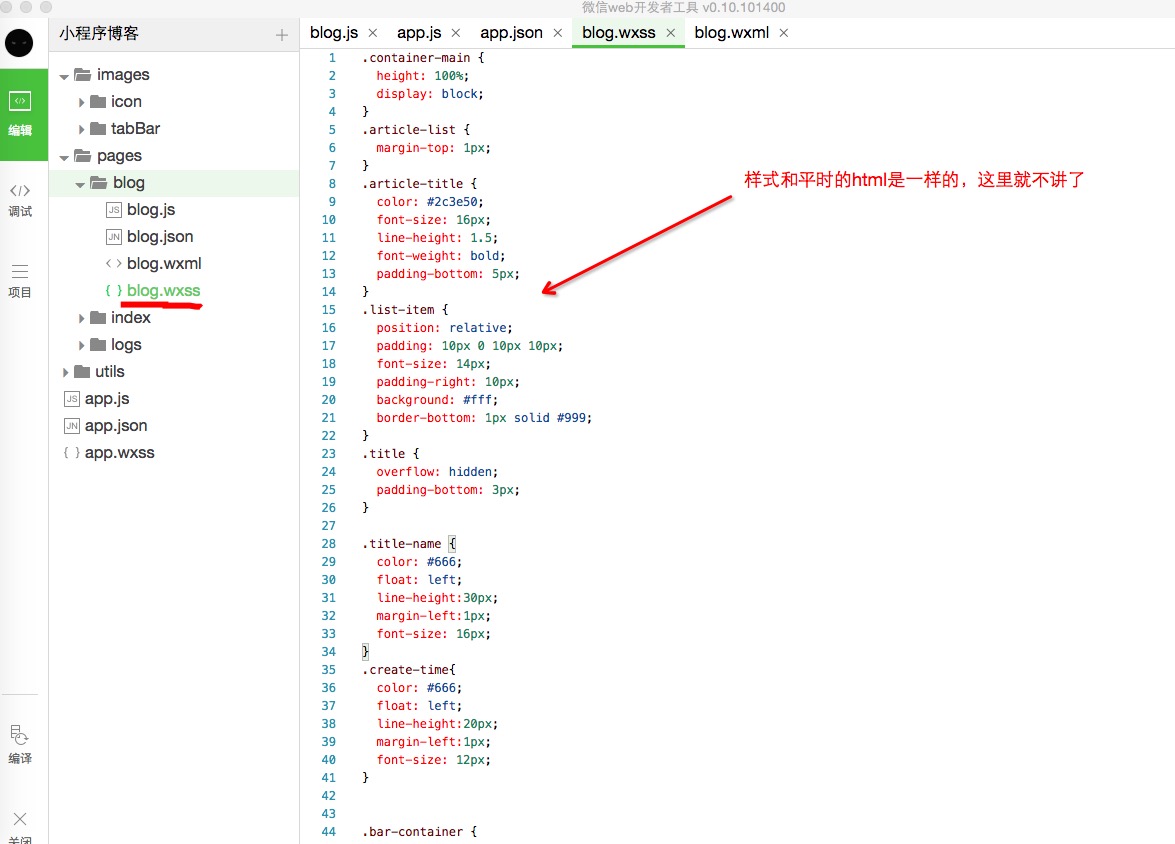 10、處理樣式,view標(biāo)簽可以使用css3的樣式,并且微信本身也提供一些計(jì)算尺寸的方法,也支持樣式選擇器,類選擇器,id選擇器,直接看代碼,編輯我們的blog.wxss