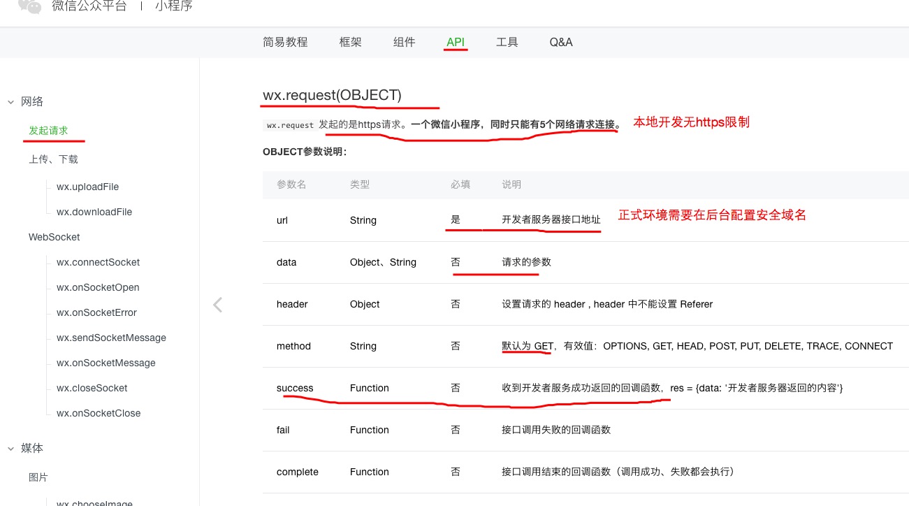 打開(kāi)微信文檔,里面有對(duì)應(yīng)的網(wǎng)絡(luò)請(qǐng)求api,wx.request(),接收一個(gè)對(duì)象,包含我們請(qǐng)求的各種參數(shù)(交互的域名正式環(huán)境有限制,而且需要為https)