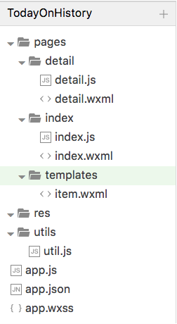 pages/logs/ pages/index/index.wxsspages/detail/ pages/detail/detail.js pages/detail/detail.wxml pages/templates/ pages/templates/item.wxml res/