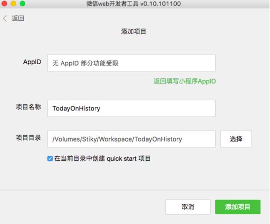先創(chuàng)建一個(gè)工程,依次點(diǎn)擊「添加項(xiàng)目」--「無(wú)AppID」,然后填好「項(xiàng)目名稱」并選擇「項(xiàng)目目錄」,點(diǎn)擊「添加項(xiàng)目」
