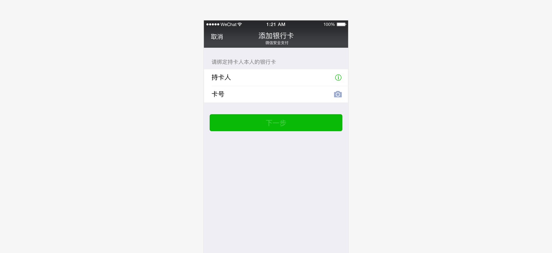 例如下圖中,在添加銀行卡時,采用攝像頭識別接口來幫助用戶輸入。除此之外微信團隊還對外開放例如地理位置接口等多種微信小程序接口 ,充分利用這些接口將大大提高用戶輸入的效率和準確性,進而優(yōu)化體驗。