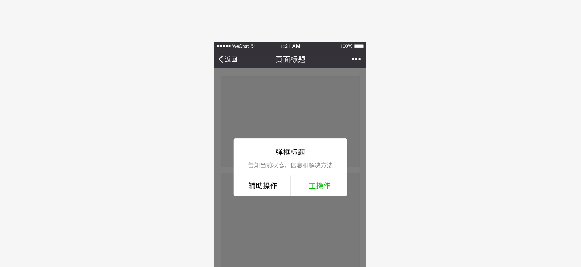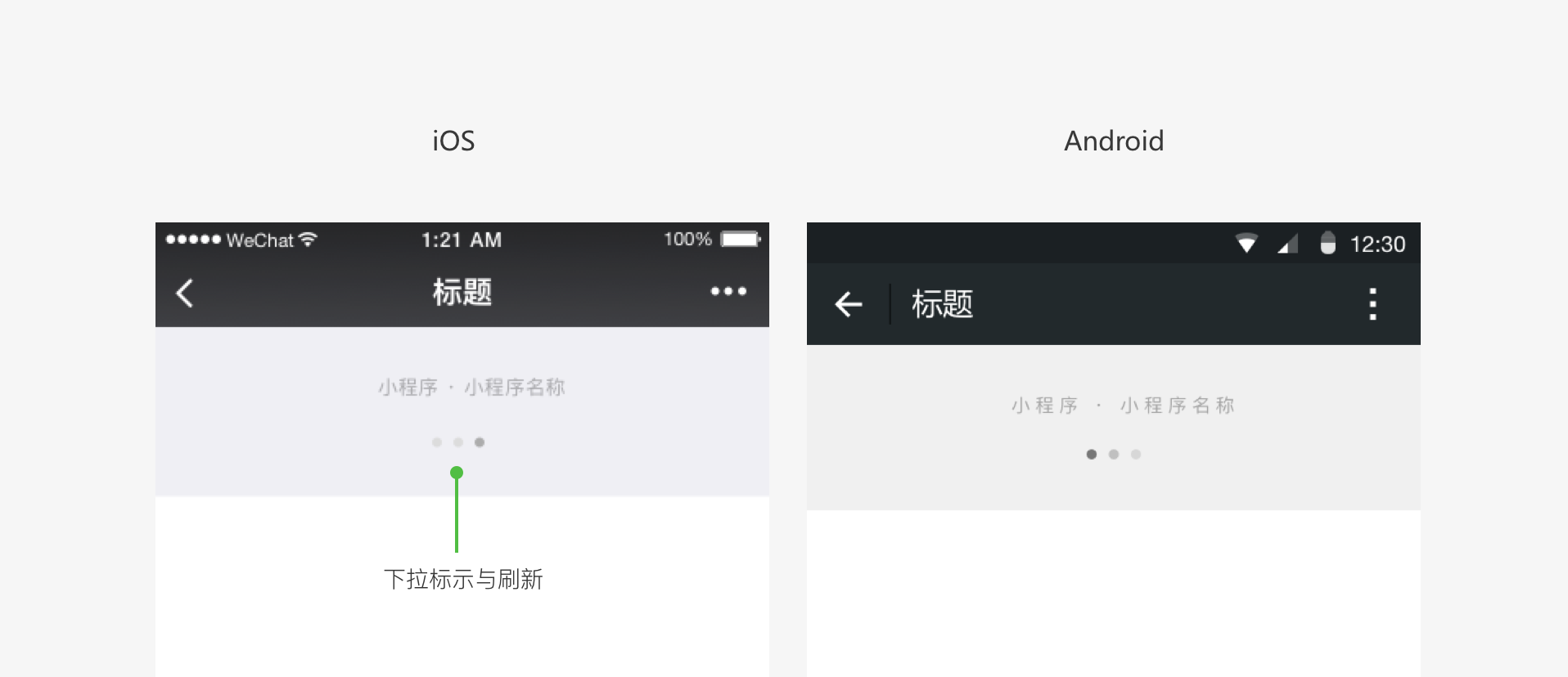 微信下拉提示用于給用戶明確的小程序歸屬者,防止造假與作弊。此處標示提供深淺兩套方案,文字顏色不可自定義,開發(fā)者在自定義背景色時,應(yīng)注意保證下拉標示的辨識度。iOS和Android配色方案相同如下展示。