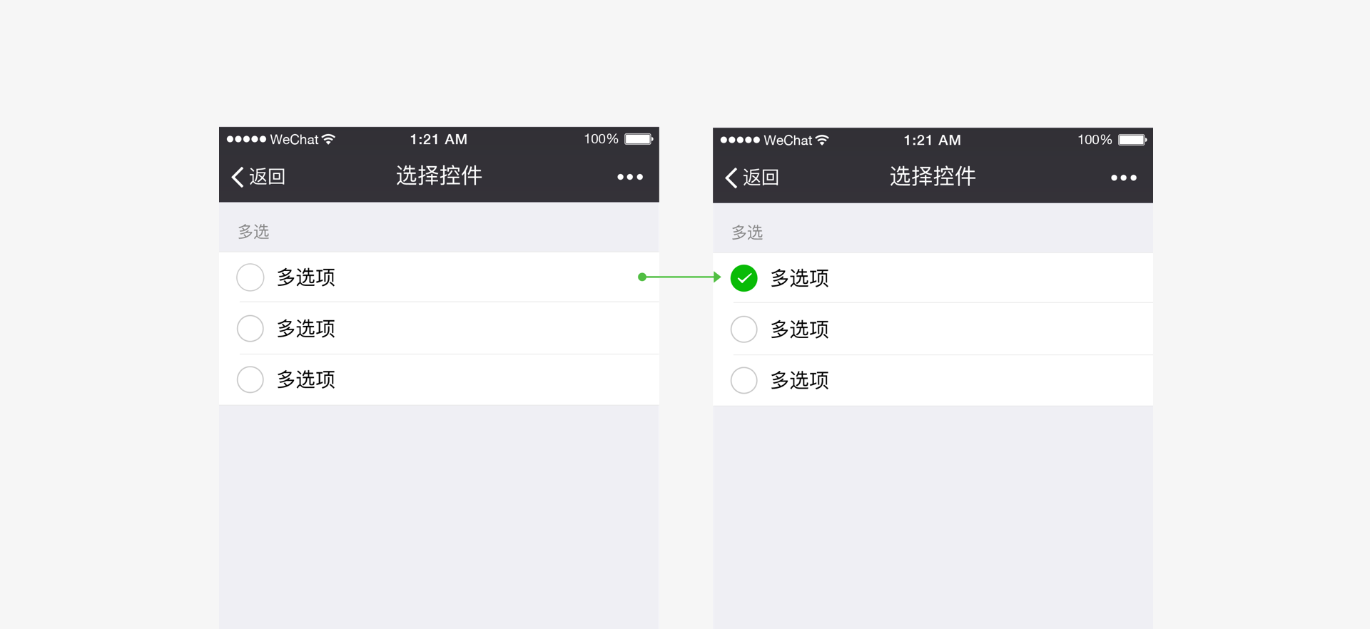 對于頁面局部的操作,可在操作區(qū)域予以直接反饋,例如點擊多選控件前后如下圖。對于常用控件,微信設(shè)計中心將提供控件庫,其中的控件將提供完整操作反饋。