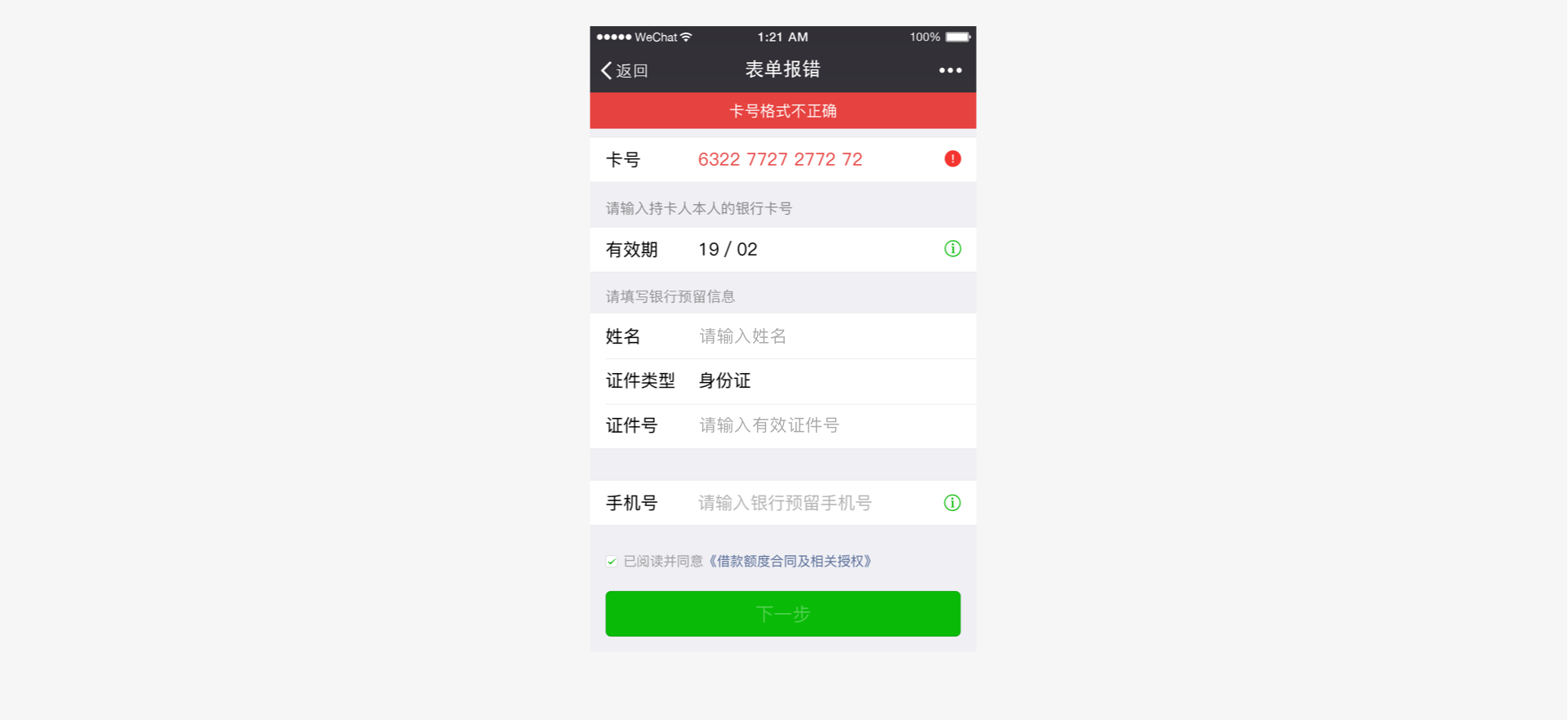 要杜絕異常狀態(tài)下,用戶莫名其妙又無處可去,卡在某一個頁面的情況。2.2中所提到的彈窗和結(jié)果頁面都可作為異常狀態(tài)的提醒方式。除此之外,在表單頁面中尤其是表單項較多的頁面中,還應(yīng)明確指出出錯項目,以便用戶修改。