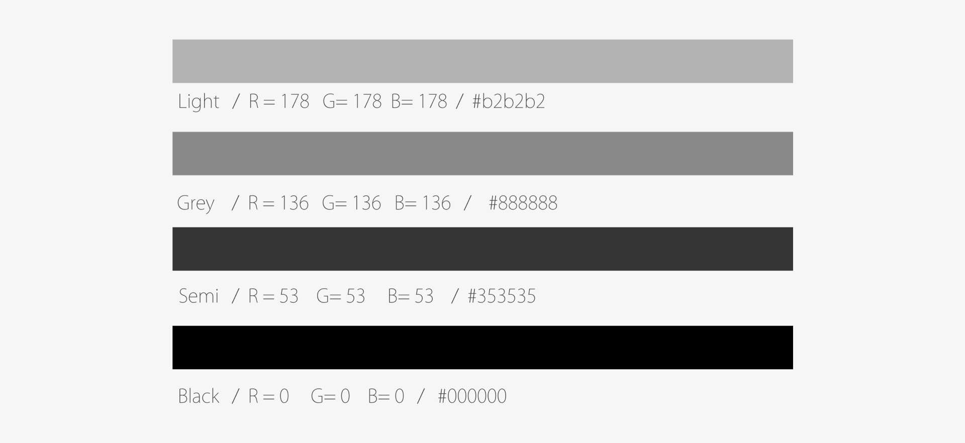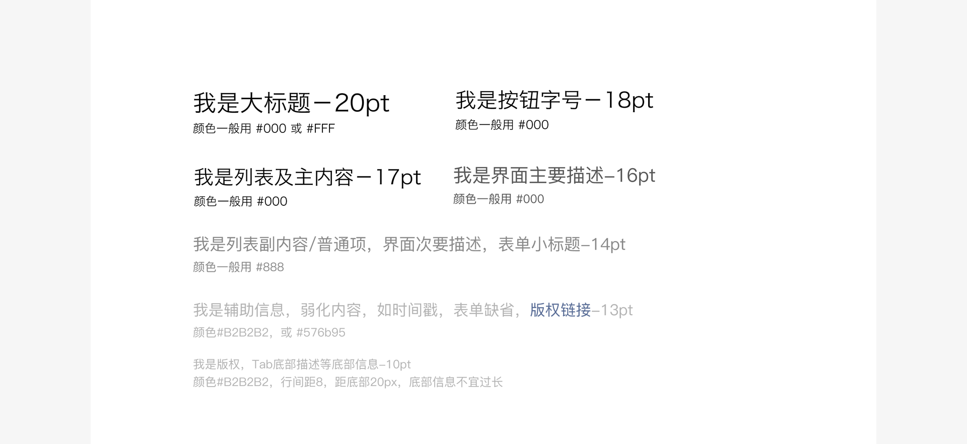主內(nèi)容 Black 黑色,次要內(nèi)容 Grey 灰色;時間戳與表單缺省值 Light 灰色;大段的說明內(nèi)容而且屬于主要內(nèi)容用 Semi 黑;