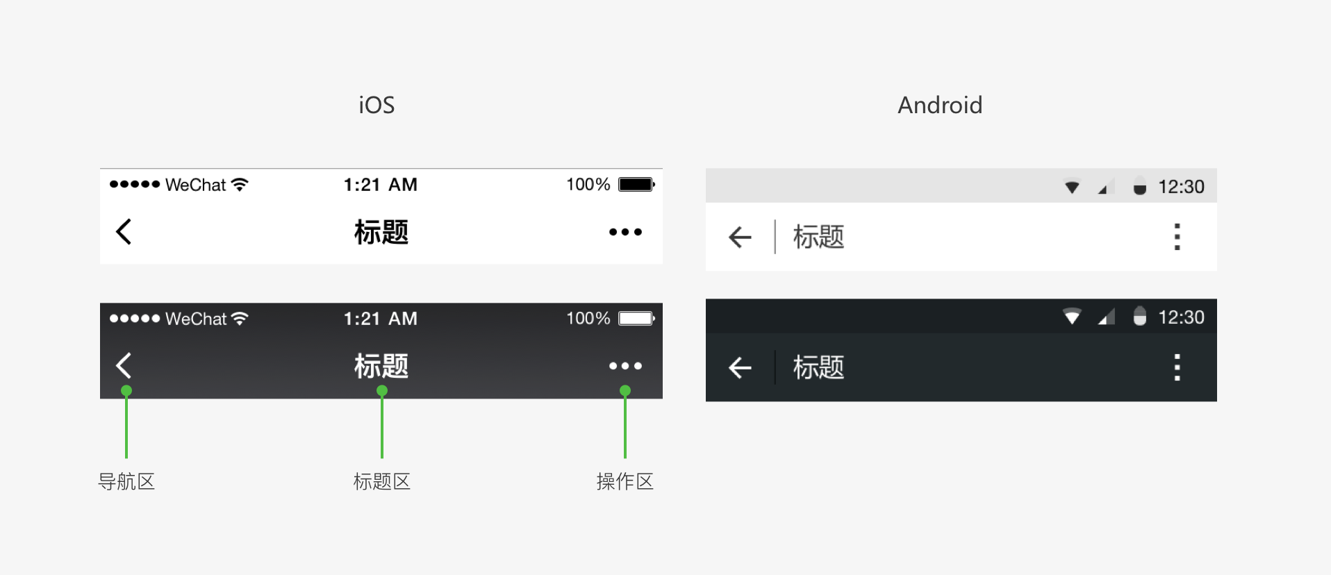 微信導(dǎo)航欄分為導(dǎo)航區(qū)域、標題區(qū)域以及操作區(qū)域。其中導(dǎo)航區(qū)控制程序頁面進程。目前導(dǎo)航欄分深淺兩種基本配色。