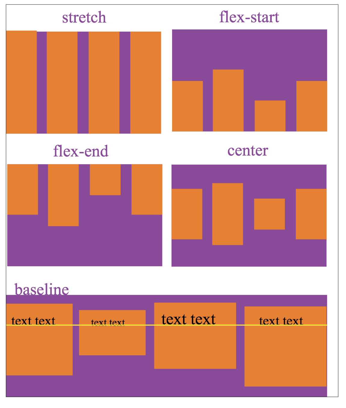 align-tiems設置的對齊方式,和側(cè)軸的方向有關,下圖以flex-direction為row,側(cè)軸方向是從上到下,描述align-items的5個值顯示效果: