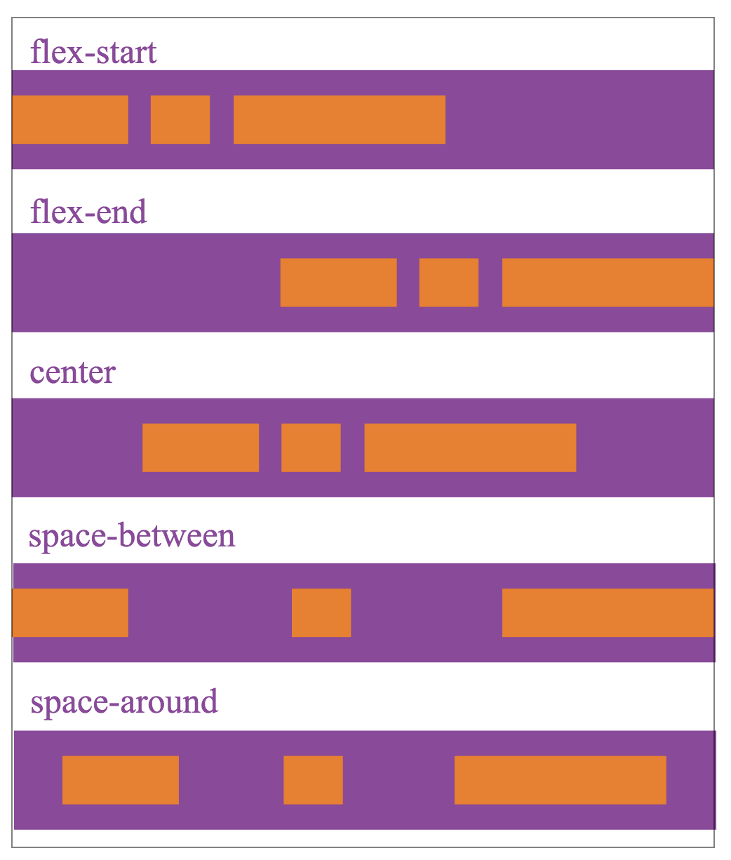 space-around 每個子元素之間的距離相等,兩端的子元素距離容器的距離也和其它子元素之間的距離相同。justify-content的對齊方式和主軸的方向有關,下圖以flex-direction為row,主軸方式是從左到右,描述jstify-content5個值的顯示效果: