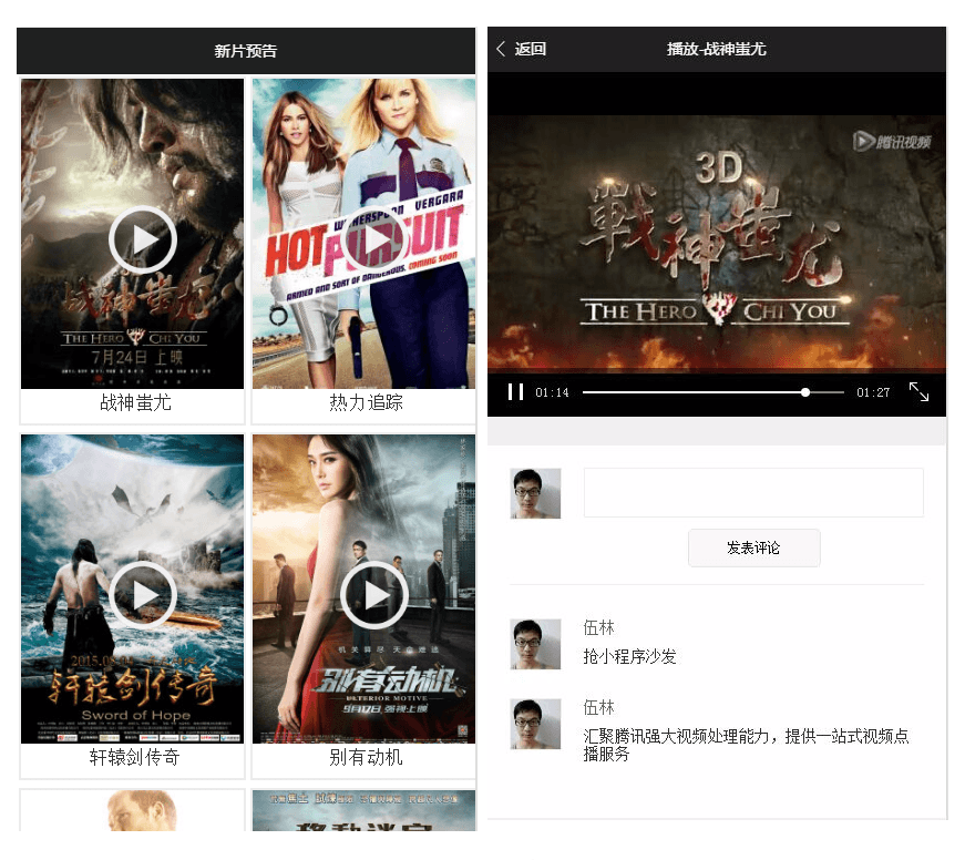 app: 新片預(yù)告應(yīng)用包代碼,可直接在微信開(kāi)發(fā)者工具中作為項(xiàng)目打開(kāi)server: 搭建的Node服務(wù)端代碼,作為服務(wù)器和app通信,提供 CGI 接口示例用于拉取云數(shù)據(jù)庫(kù)上的視頻列表、評(píng)論列表,將評(píng)論數(shù)據(jù)提交到云數(shù)據(jù)庫(kù)新片預(yù)告主要功能如下: