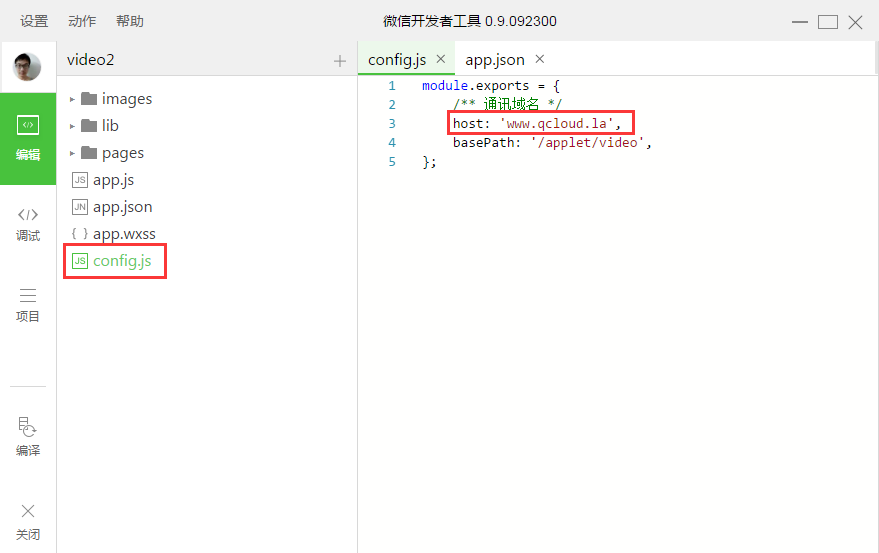 在微信開(kāi)發(fā)者工具將新片預(yù)告應(yīng)用包源碼添加為項(xiàng)目,并把源文件config.js中的通訊域名修改成上面申請(qǐng)的域名。