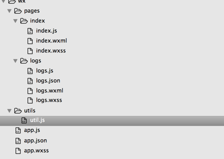 然后來看下項(xiàng)目index和logs文件夾。微信小程序初始項(xiàng)目把每個頁面相關(guān)的js、wxss、wxml放在各自的文件,這樣看起來結(jié)構(gòu)清晰明朗很多。