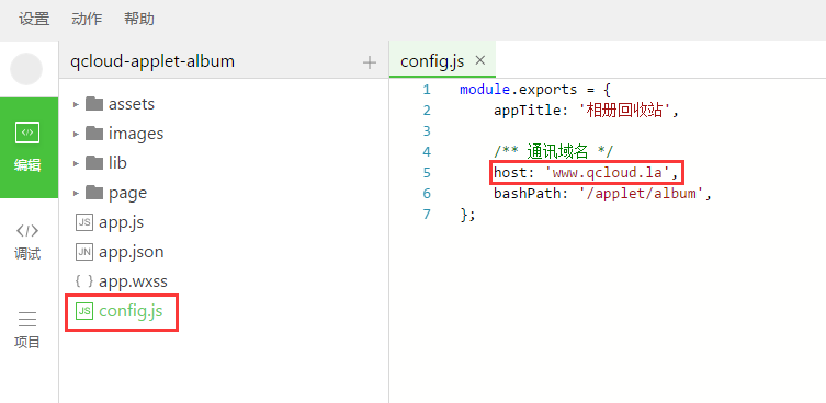 在微信開發(fā)者工具將小相冊應用包源碼添加為項目,并把源文件config.js中的通訊域名修改成上面申請的域名。