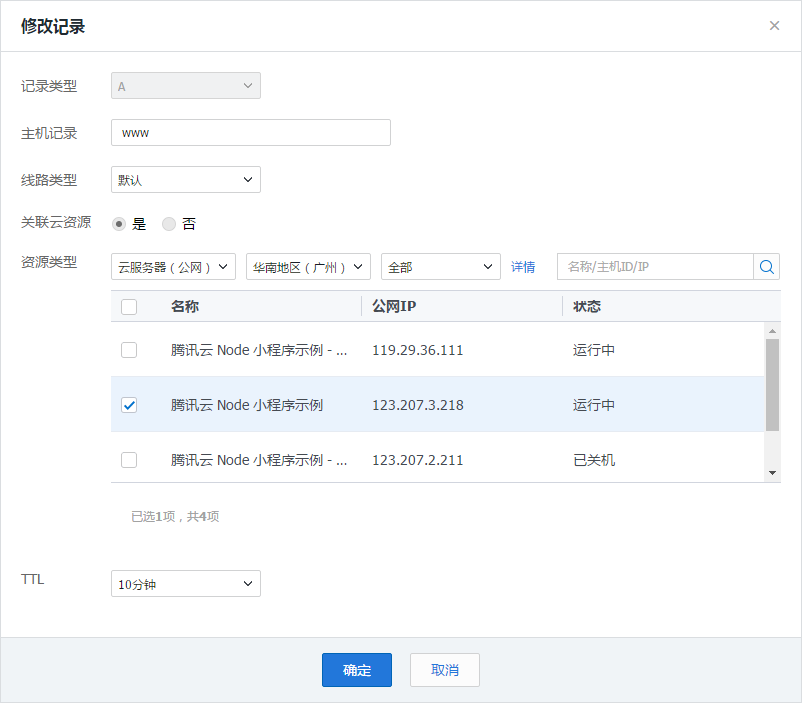 在騰訊云注冊的域名,可以直接使用云解析控制臺來添加主機記錄,直接選擇上面購買的 CVM。