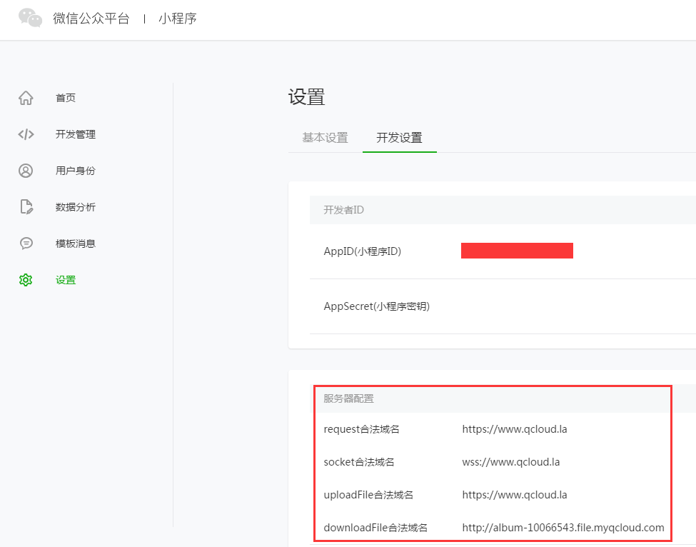 注意:需要將 www.qcloud.la 設置為上面申請的域名,將 downloadFile 合法域名設置為在 COS 管理控制臺中自己創(chuàng)建的 bucket 的相應 CDN 加速訪問地址,如下圖所示: