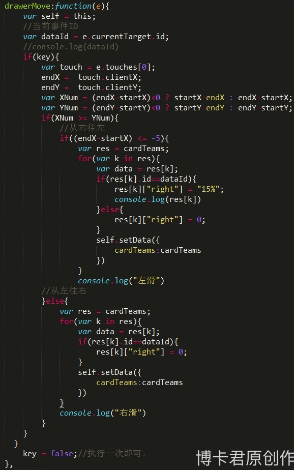 我們?cè)?bindtouchstart 時(shí)記錄到開始的點(diǎn),在 bindtouchmove 記錄到觸摸結(jié)束的點(diǎn),如果 X 軸滑動(dòng)大于 Y 軸的,再如果結(jié)束點(diǎn)-開始點(diǎn)小于一個(gè)數(shù)值(這個(gè)數(shù)組可以自己設(shè)置,鑒于靈敏度,我這設(shè)置的很?。?,右滑也是同理。