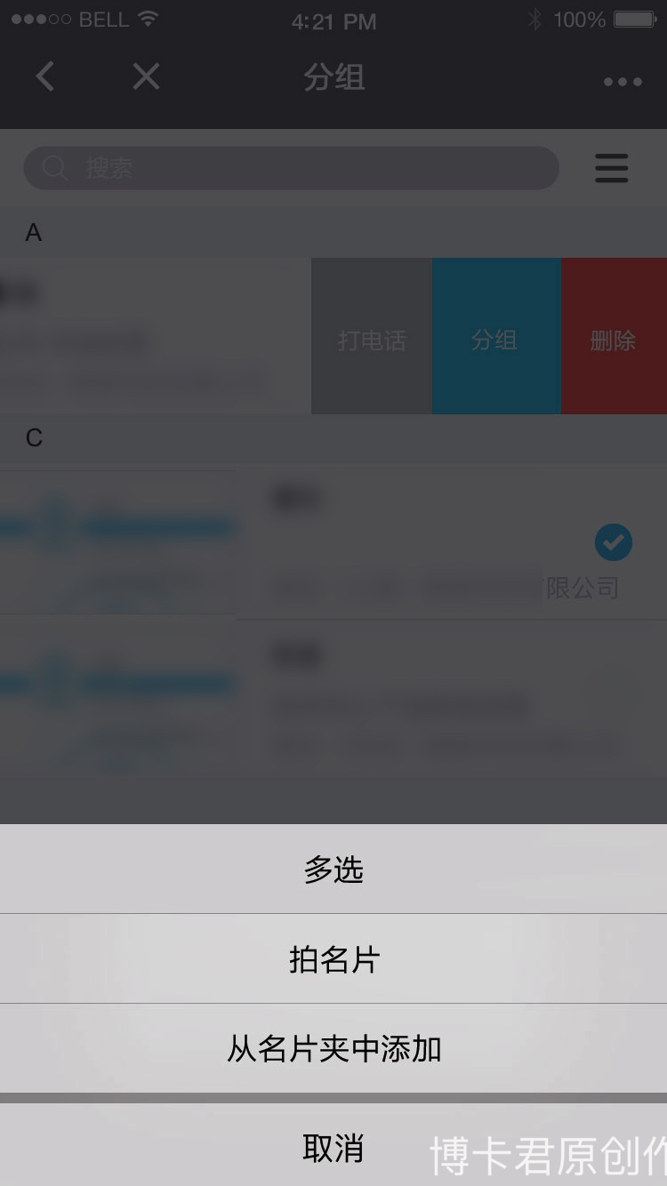 選擇好名片后點(diǎn)擊設(shè)置分組會(huì)彈出新建好的分組列表供用戶確定設(shè)置到那個(gè)分組里面(這里由于后臺(tái)接口方面還在完善,不繼續(xù)往下寫了)。