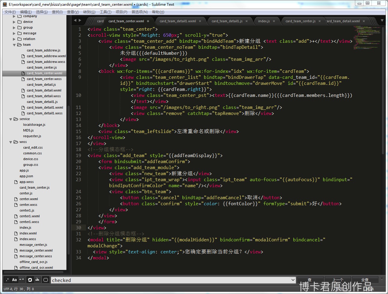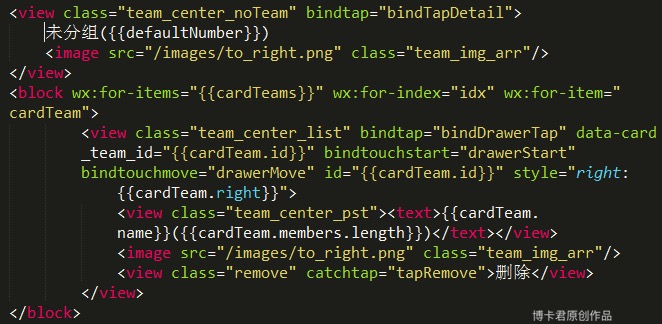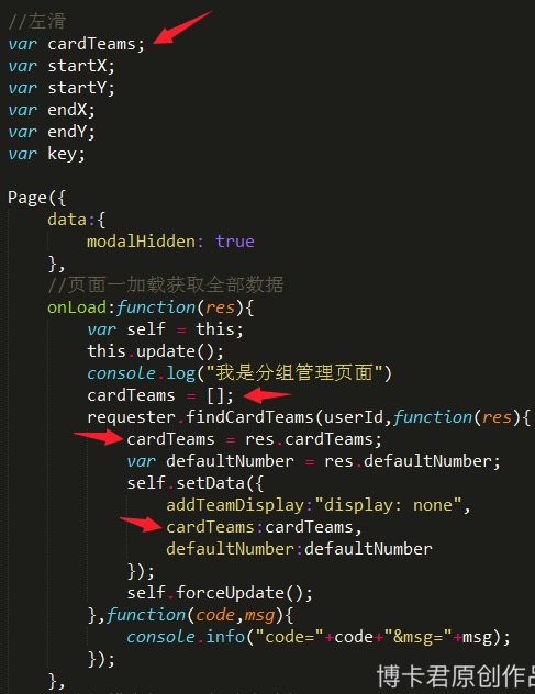 判斷到左滑與右滑事件后,我們就需要對(duì)當(dāng)前組件綁定數(shù)據(jù)了,數(shù)據(jù)從那里來(lái)?可以看下我這數(shù)組一個(gè)來(lái)歷,以及怎么被左滑事件里面獲取到(我這數(shù)據(jù)是一個(gè)數(shù)組,需要在 wxml 里面 block 的)。