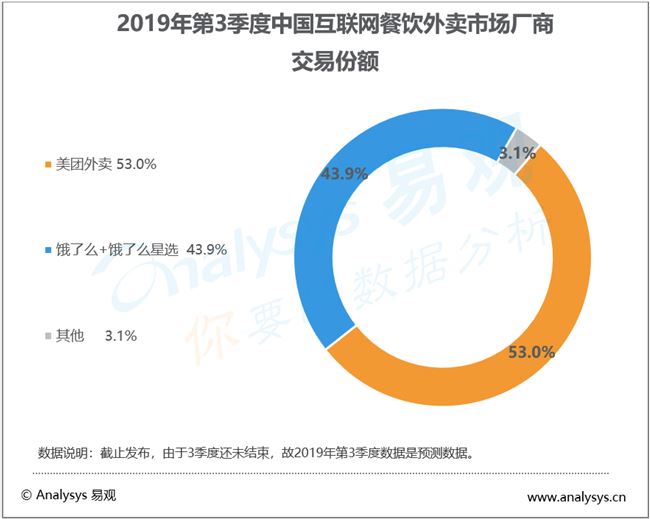 從易觀的數(shù)據(jù)來看,截至 2019 年第三季度,國內(nèi)外賣市場格局已經(jīng)完全是二分天下,行業(yè)競爭壁壘高筑。其中,美團(tuán)的市場份額為53%,餓了么+餓了么星選的市場份額為43.9%,其他外賣平臺的市場份額僅有3.1%。