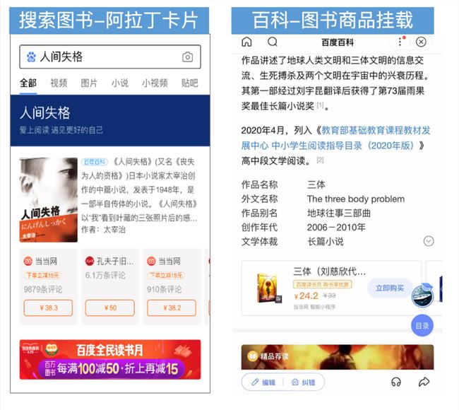 當用戶在百度搜索某圖書名,如人間失格,在搜索結果頁會出現(xiàn)阿拉丁卡片,同一屏內(nèi),用戶可以一目了然看到圖書的介紹以及一鍵下單,再往下翻頁,點擊進入百度百科內(nèi)容頁,在這里也有圖書商品掛在,點擊就可以進入當當小程序一鍵下單。